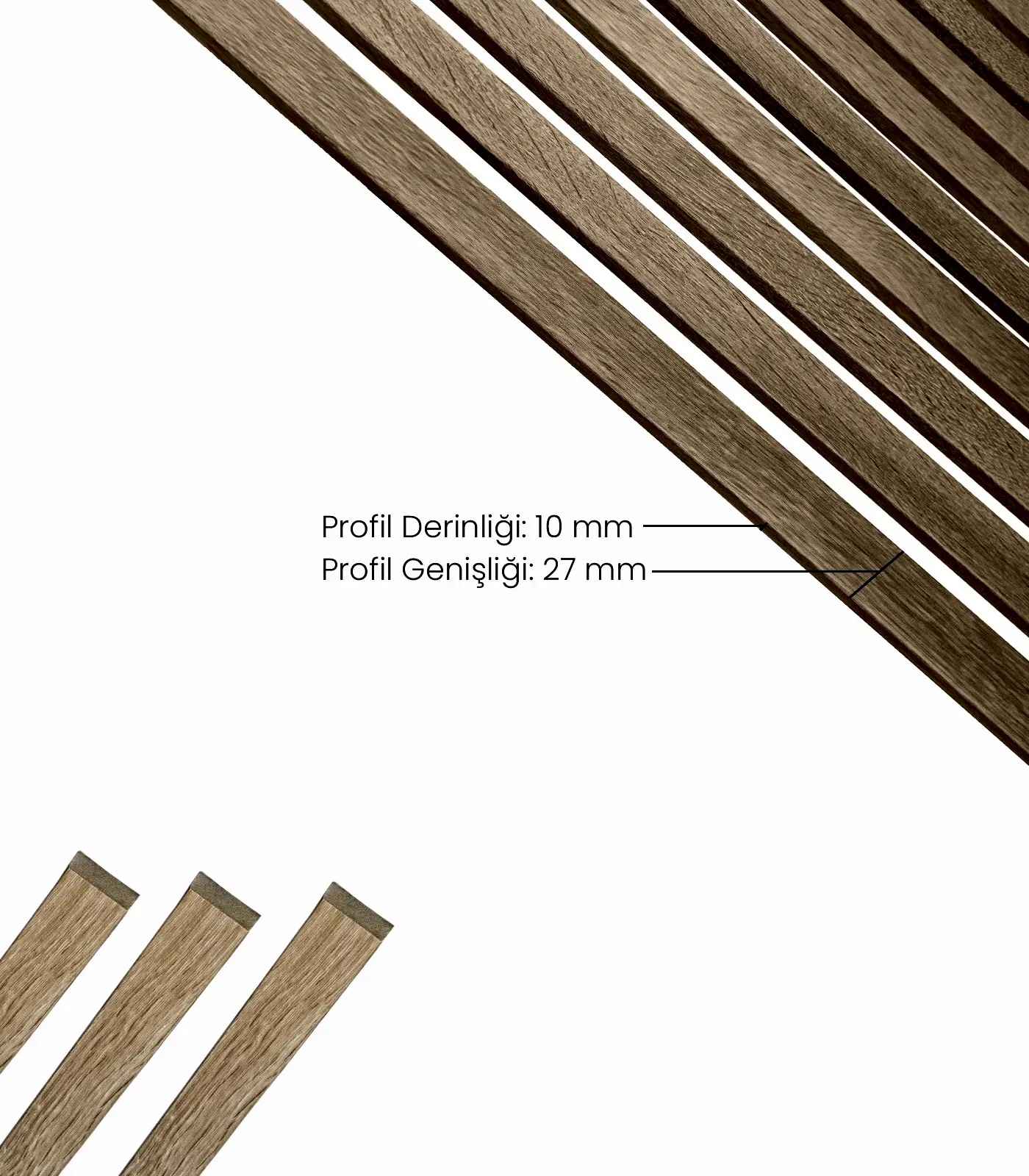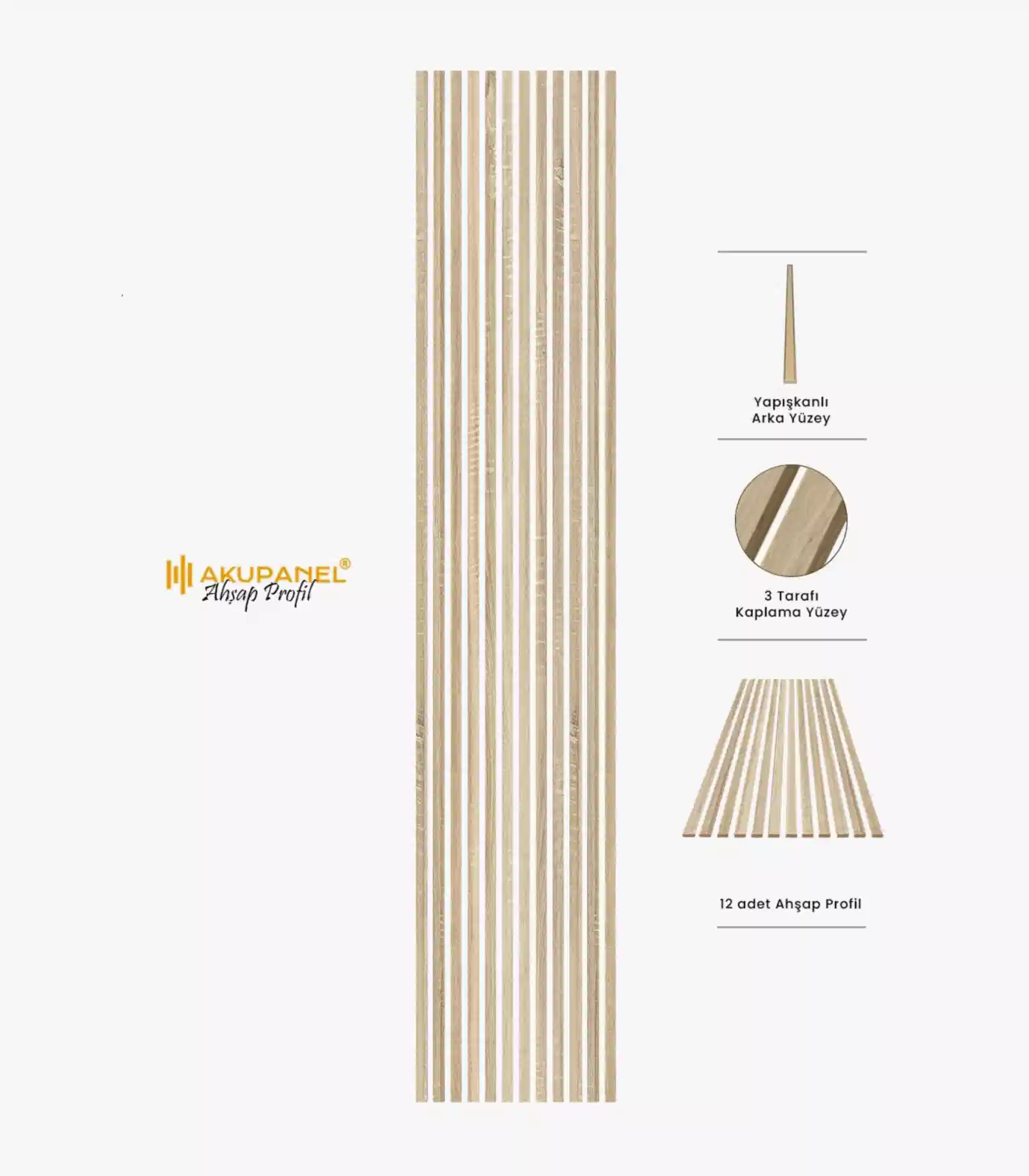 Ahşap profiller, bir inovasyon ürünüdür. Bir profilin ölçüleri 2,7×240 cm’dir. Paket içeriğinde 12 adet ahşap duvar profili bulunmaktadır. Ahşap duvar profillerinin arka yüzeyinde özel olarak üretilmiş yapışkanı bulunmaktadır. Ahşap profilin derinliği 10 mm’dir. Oldukça hafif olup, kendin yap deneyimi ile sadece 3 adımda duvara kolayca montajını yapabilirsiniz.