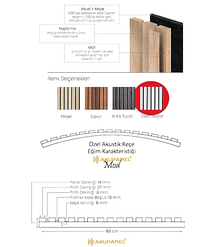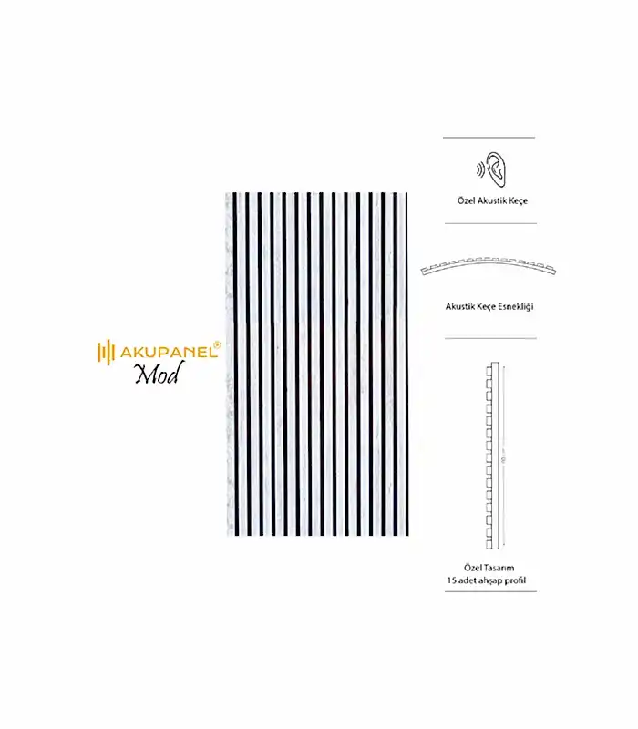 Akupanel, akustik ve dekorasyonu bir araya getiren inovasyon ürünüdür. Bir akupanel ölçülerimiz 60×120 cm dir. Bir akupanel ahşap duvar panelinde 8 adet ahşap profil bulunmaktadır. Ahşap duvar profilleri özel olarak üretilmiş sertifikalı akustik keçe üzerine montajı yapılmıştır. Akupanel’in derinliği 14 mm dir. Oldukça hafif ve eğimli duvarları saracak şekilde esnek bir yapıya sahiptir. Kendin yap deneyimi ile sadece 3 adımda duvara kolayca montajını yapabilirsiniz.