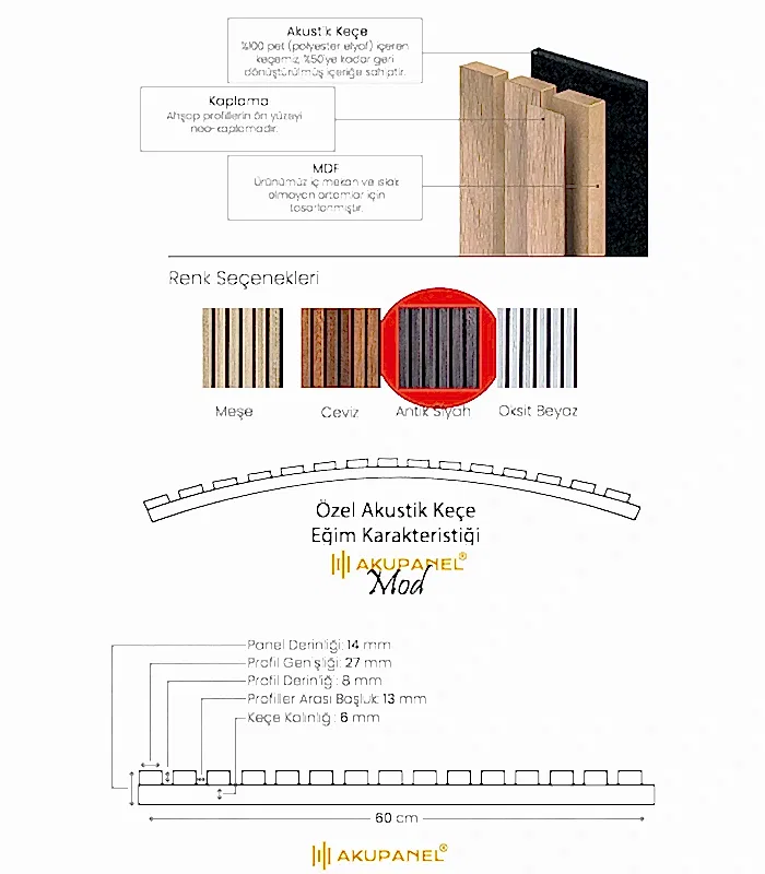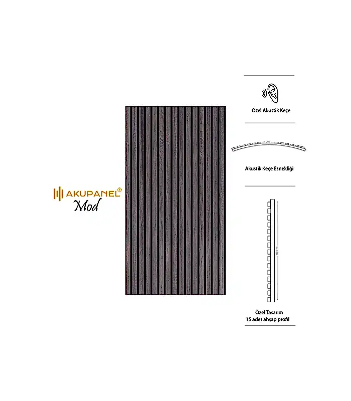 Akupanel, akustik ve dekorasyonu bir araya getiren inovasyon ürünüdür. Bir akupanel ölçülerimiz 60×120 cm dir. Bir akupanel ahşap duvar panelinde 8 adet ahşap profil bulunmaktadır. Ahşap duvar profilleri özel olarak üretilmiş sertifikalı akustik keçe üzerine montajı yapılmıştır. Akupanel’in derinliği 14 mm dir. Oldukça hafif ve eğimli duvarları saracak şekilde esnek bir yapıya sahiptir. Kendin yap deneyimi ile sadece 3 adımda duvara kolayca montajını yapabilirsiniz.