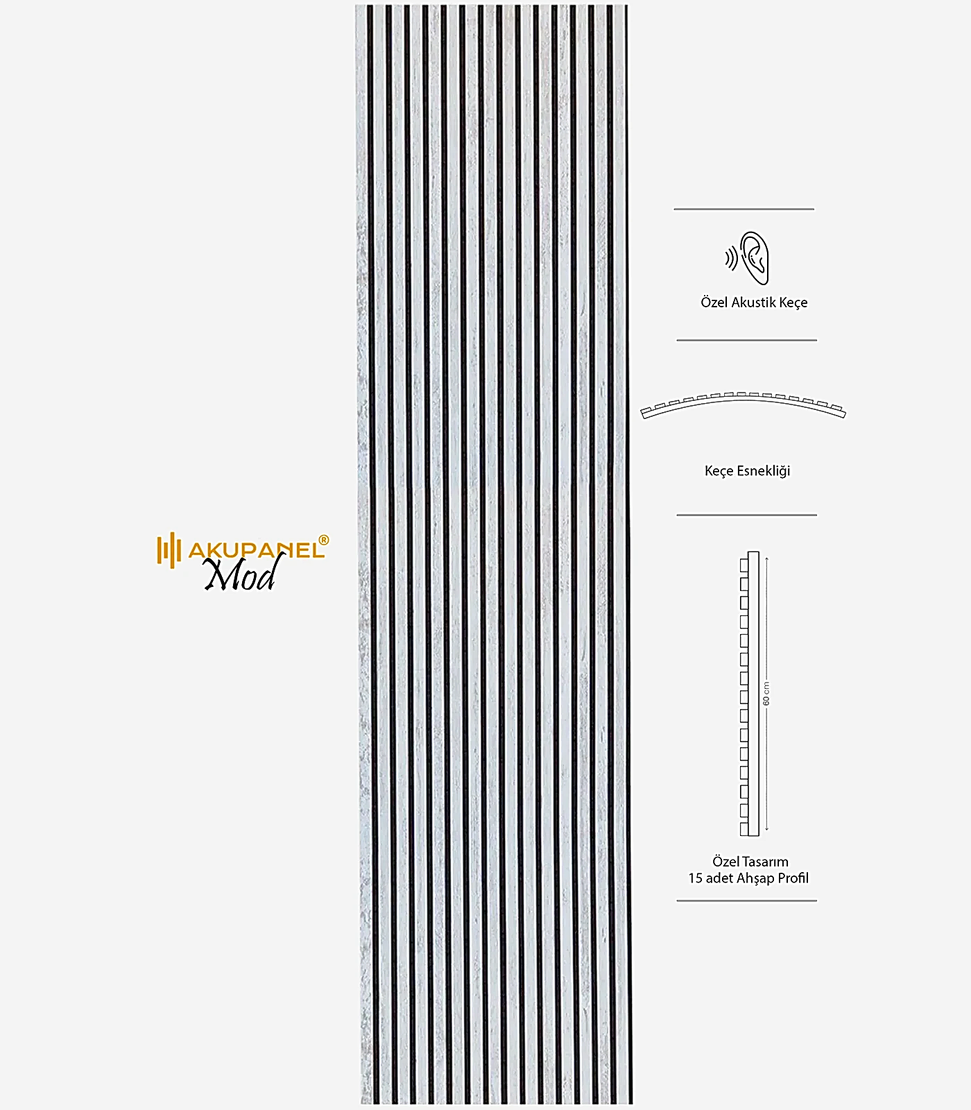 Akupanel, akustik ve dekorasyonu bir araya getiren inovasyon ürünüdür. Bir akupanel ölçülerimiz 60×245 cm dir. Bir akupanel ahşap duvar panelinde 15 adet ahşap profil bulunmaktadır. Ahşap duvar profilleri özel olarak üretilmiş sertifikalı akustik keçe üzerine montajı yapılmıştır. Akupanel’in derinliği 14 mm dir. Oldukça hafif ve eğimli duvarları saracak şekilde esnek bir yapıya sahiptir. Kendin yap deneyimi ile sadece 3 adımda duvara kolayca montajını yapabilirsiniz.