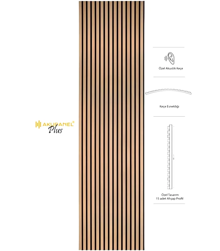 Akupanel, akustik ve dekorasyonu bir araya getiren inovasyon ürünüdür. Bir akupanel ölçülerimiz 60×245 cm dir. Bir akupanel ahşap duvar panelinde 15 adet ahşap profil bulunmaktadır. Ahşap duvar profilleri özel olarak üretilmiş sertifikalı akustik keçe üzerine montajı yapılmıştır. Akupanel’in derinliği 16 mm dir. Oldukça hafif ve eğimli duvarları saracak şekilde esnek bir yapıya sahiptir. Kendin yap deneyimi ile sadece 3 adımda duvara kolayca montajını yapabilirsiniz.
