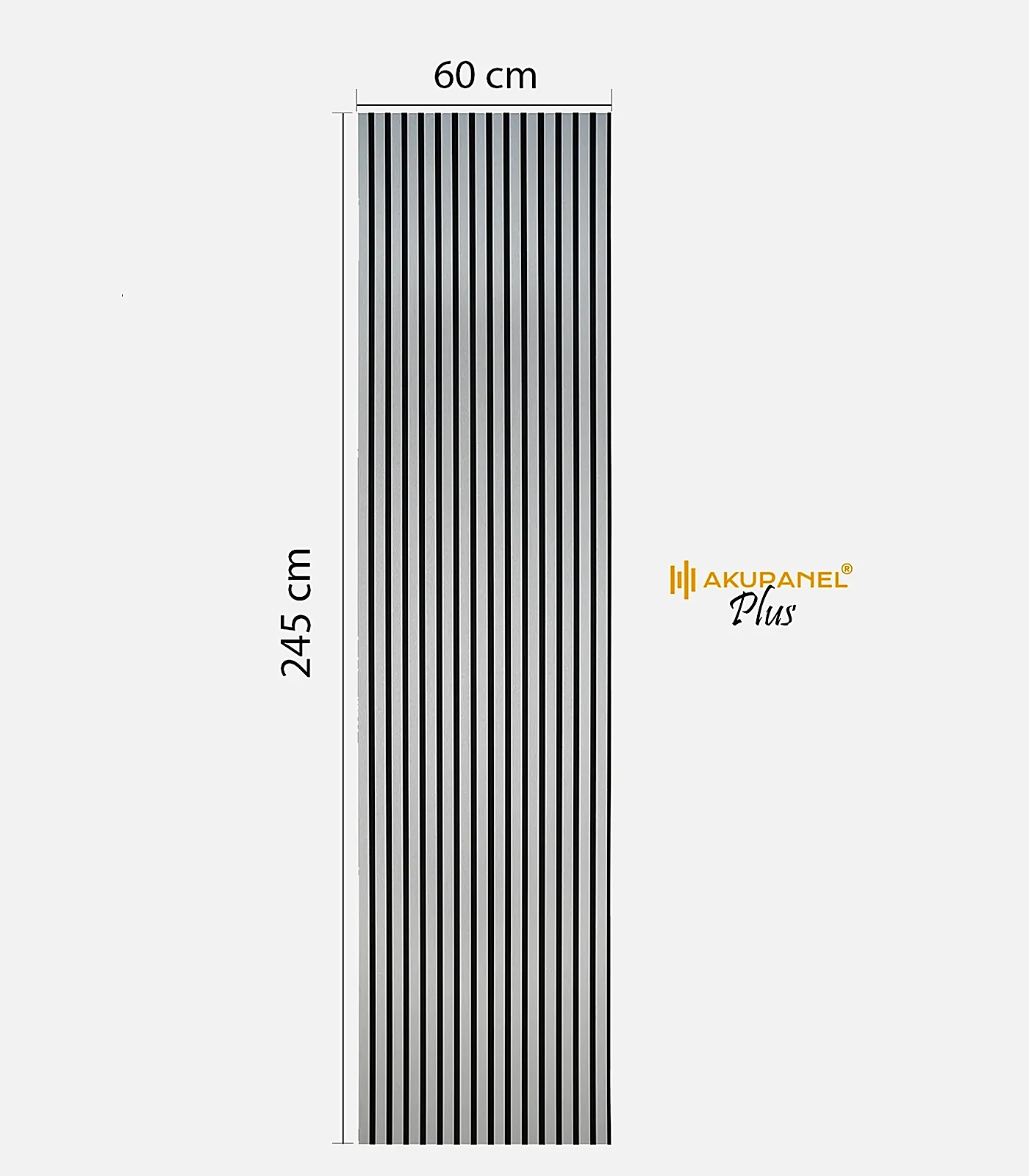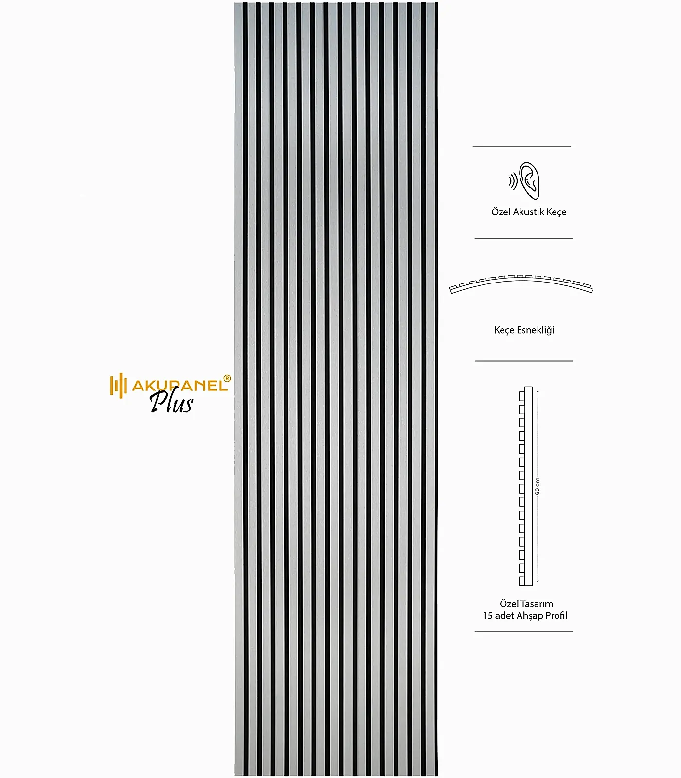 Akupanel, akustik ve dekorasyonu bir araya getiren inovasyon ürünüdür. Bir akupanel ölçülerimiz 60×245 cm dir. Bir akupanel ahşap duvar panelinde 15 adet ahşap profil bulunmaktadır. Ahşap duvar profilleri özel olarak üretilmiş sertifikalı akustik keçe üzerine montajı yapılmıştır. Akupanel’in derinliği 16 mm dir. Oldukça hafif ve eğimli duvarları saracak şekilde esnek bir yapıya sahiptir. Kendin yap deneyimi ile sadece 3 adımda duvara kolayca montajını yapabilirsiniz.