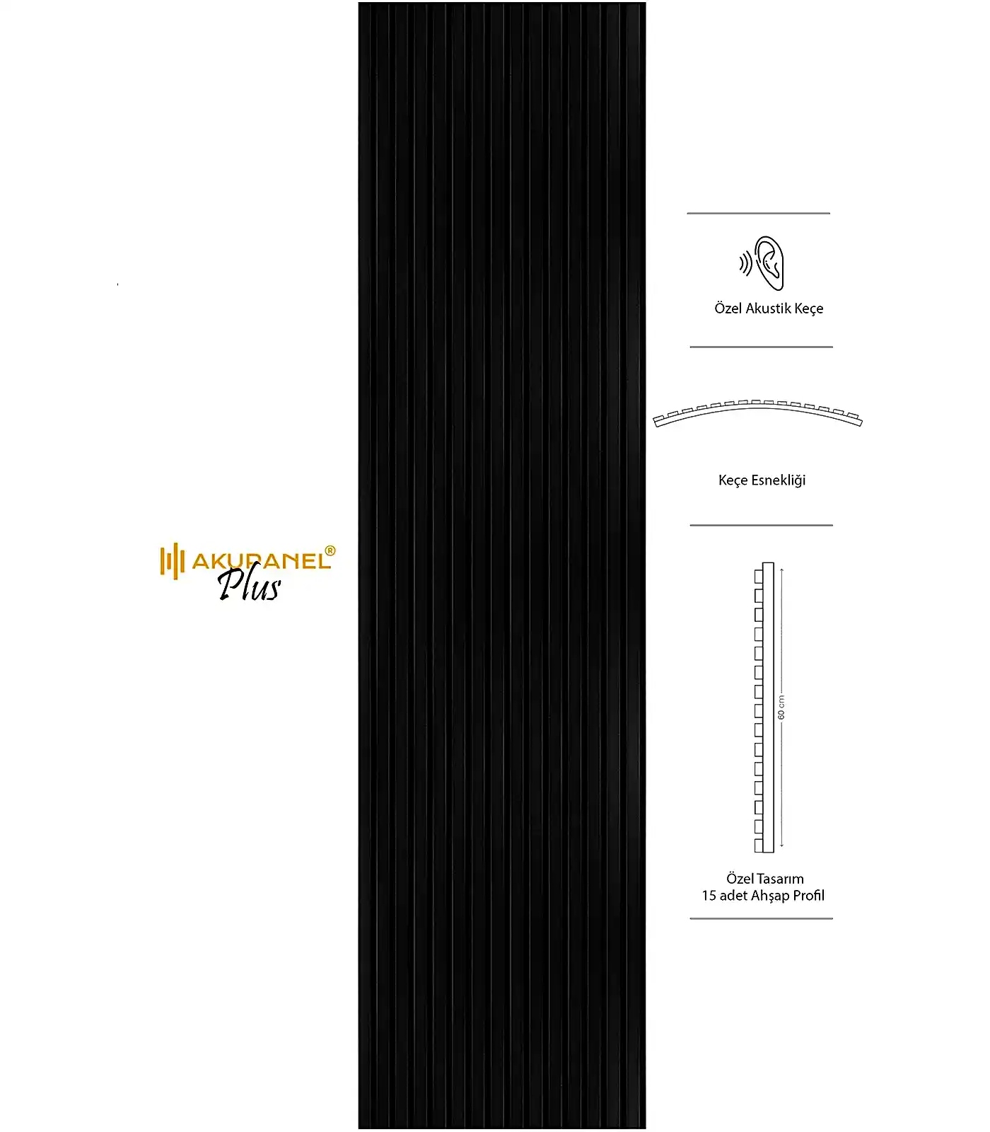 Akupanel, akustik ve dekorasyonu bir araya getiren inovasyon ürünüdür. Bir akupanel ölçülerimiz 60×245 cm dir. Bir akupanel ahşap duvar panelinde 15 adet ahşap profil bulunmaktadır. Ahşap duvar profilleri özel olarak üretilmiş sertifikalı akustik keçe üzerine montajı yapılmıştır. Akupanel’in derinliği 16 mm dir. Oldukça hafif ve eğimli duvarları saracak şekilde esnek bir yapıya sahiptir. Kendin yap deneyimi ile sadece 3 adımda duvara kolayca montajını yapabilirsiniz.
