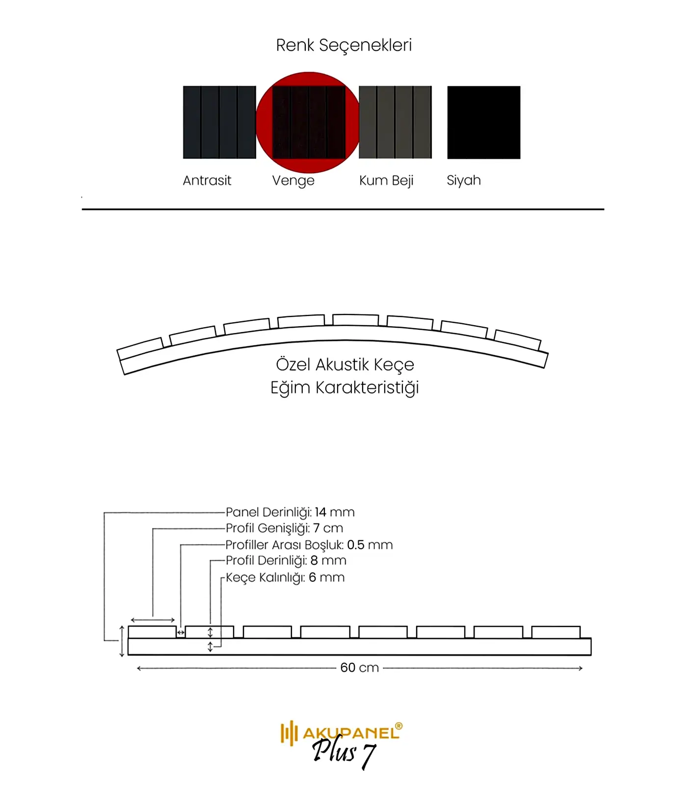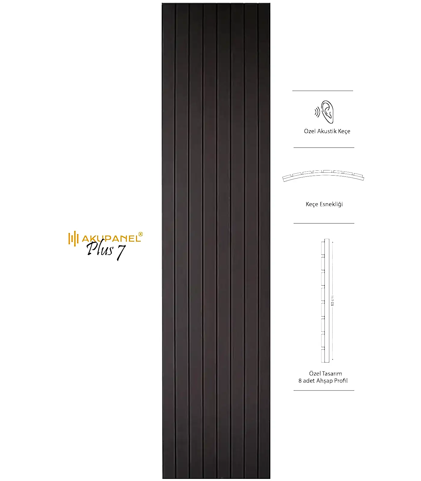 Akupanel, akustik ve dekorasyonu bir araya getiren inovasyon ürünüdür. Bir akupanel ölçülerimiz 60×245 cm dir. Bir akupanel ahşap duvar panelinde 8 adet ahşap profil bulunmaktadır. Ahşap duvar profilleri özel olarak üretilmiş sertifikalı akustik keçe üzerine montajı yapılmıştır. Akupanel’in derinliği 16 mm dir. Oldukça hafif ve eğimli duvarları saracak şekilde esnek bir yapıya sahiptir. Kendin yap deneyimi ile sadece 3 adımda duvara kolayca montajını yapabilirsiniz.